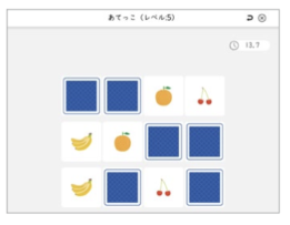 あてっこは下図のように、出てくる絵を瞬時に覚えいかに早くペアを作れるかという内容です。短期記憶力をのばすトレーニングとなります。一瞬でそれぞれのペアを記憶し、正確に素早く処理(画面タップ)していきます。
